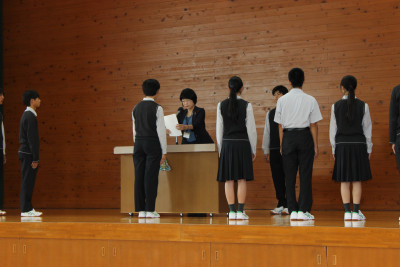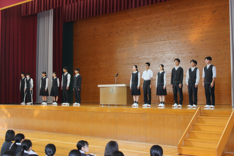 令和6年10月17日(木)全校朝礼において、後期生徒会役員認証式が行われました。山内会長以下、副会長、総務局長、総務副局長、文化局長、文化副局長、体育局長、体育副局長、の皆さん後期生徒会の活発な活動を期待しています。