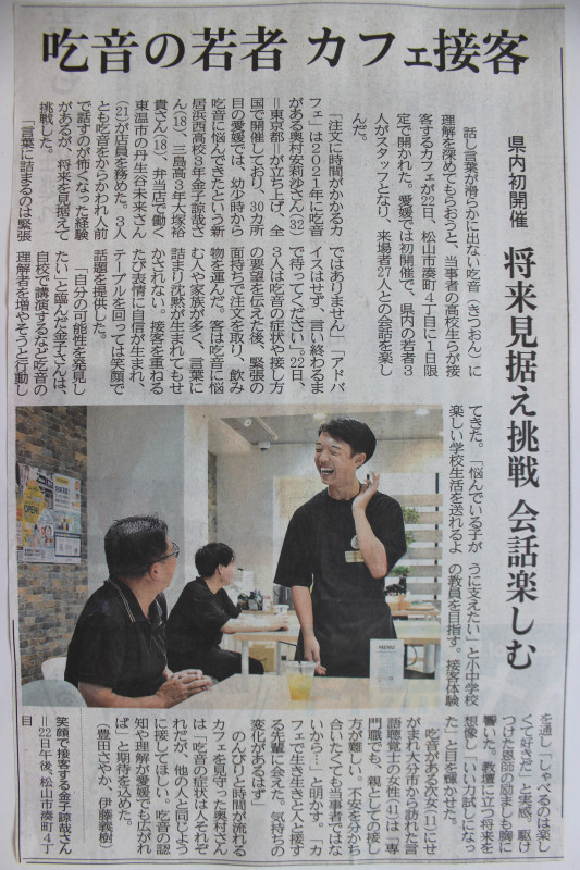 2024年9月25日 14時00分 令和6年9月22日(日)3年金子さんが松山市湊町に1日限りで開かれた「注文に時間がかかるカフェ」で接客に挑戦した記事が、愛媛新聞に掲載されました。